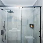 El Modern 2 Bed Sea View Apartment Pool Access cuenta con 2 dormitorios. Este apartamento dispone de cuarto de baño con secadores de pelo y toallas. También dispone de ducha a ras de suelo y un inodoro separado.